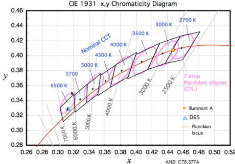 ANSI(美國國家標(biāo)準(zhǔn)組織)C78-377A 號文件使用四步MacAdam橢圓定義的方法作為CFL(小型熒光燈)和鹵素?zé)糁圃斓臉?biāo)準(zhǔn)。每一步代表了一片面積,該面積區(qū)域里的任何一個點都是離中心點一個標(biāo)準(zhǔn)差。